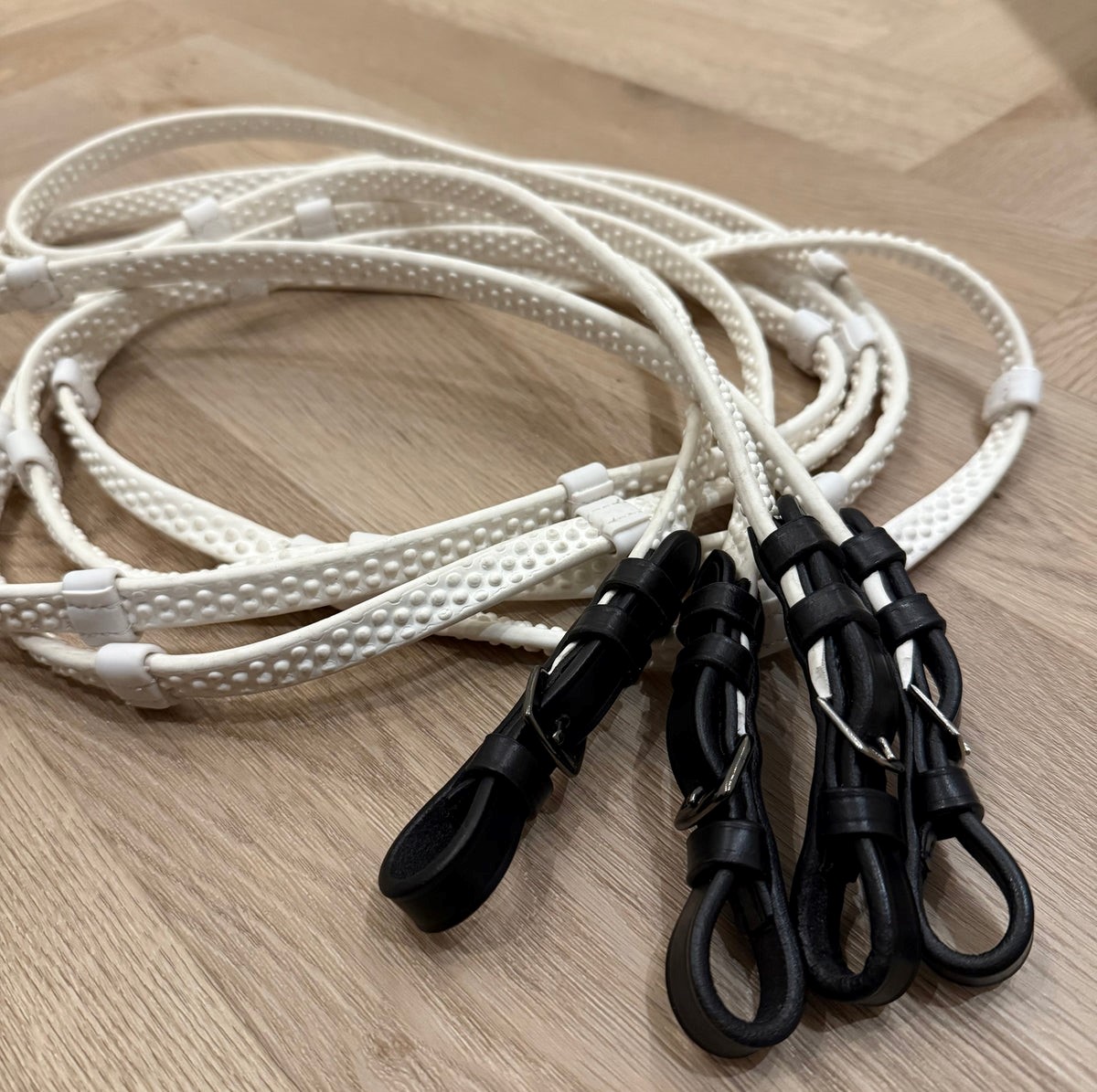 Aríus Luksus hvid biothane tøjle med dupper og stoppere – med spænde